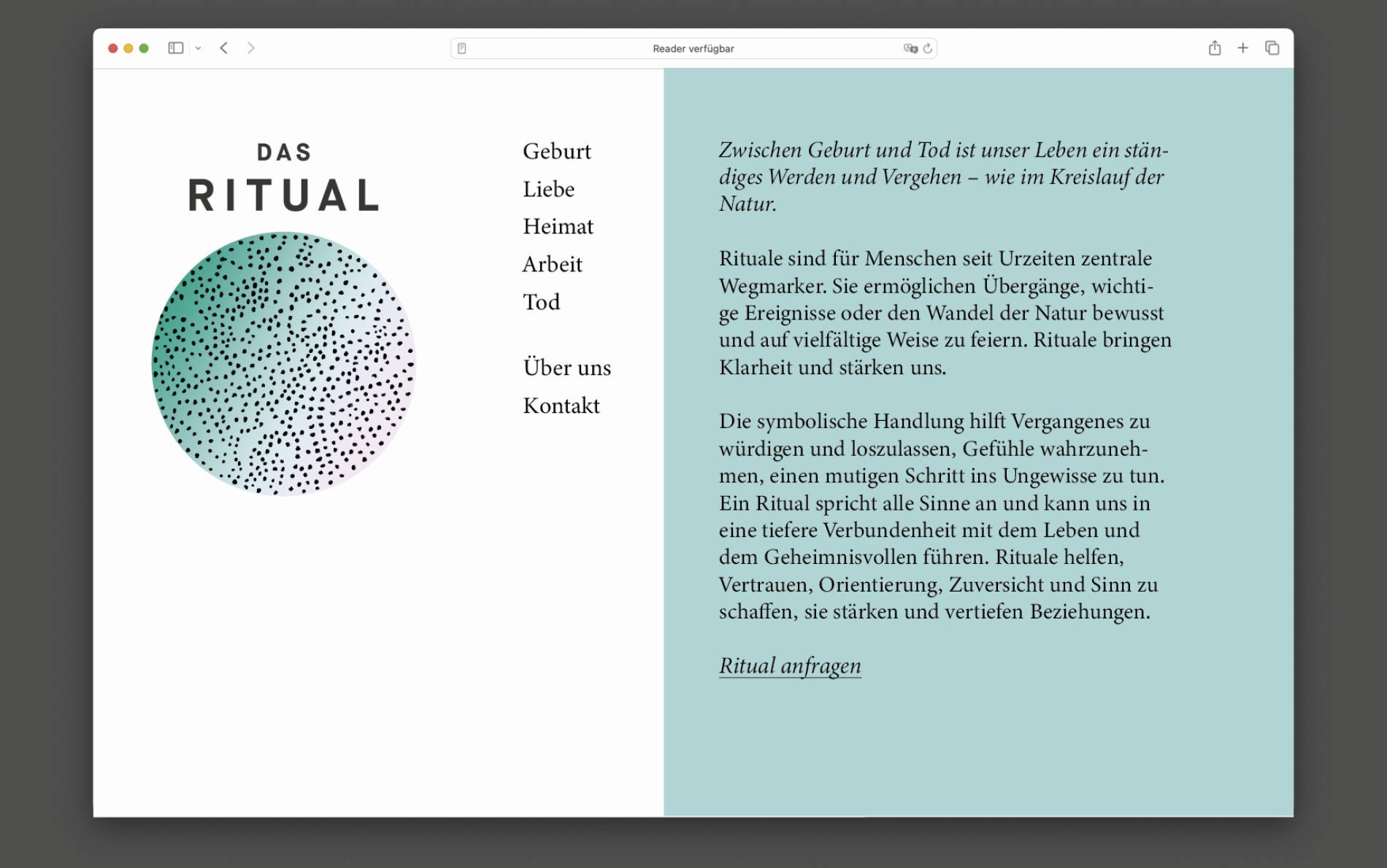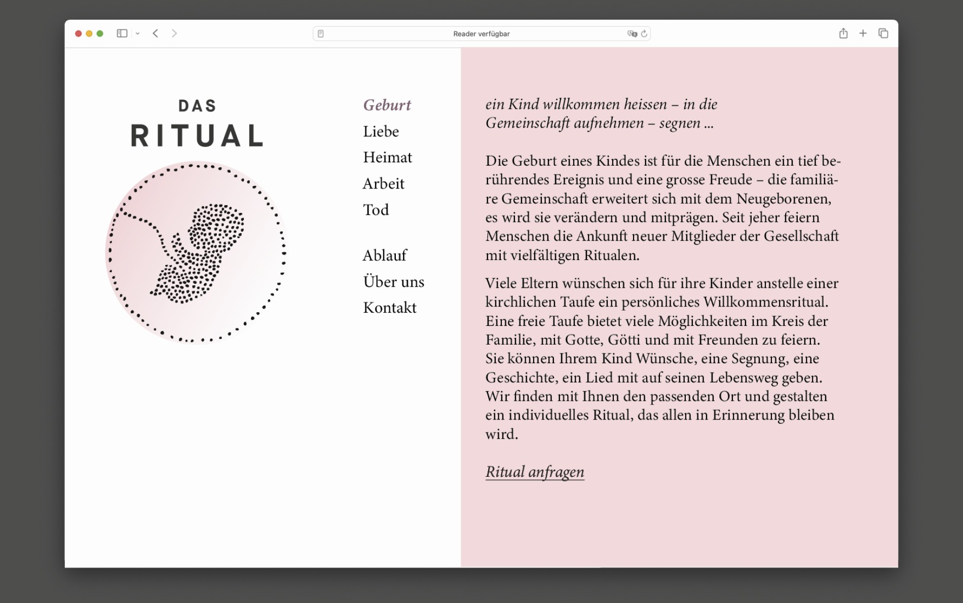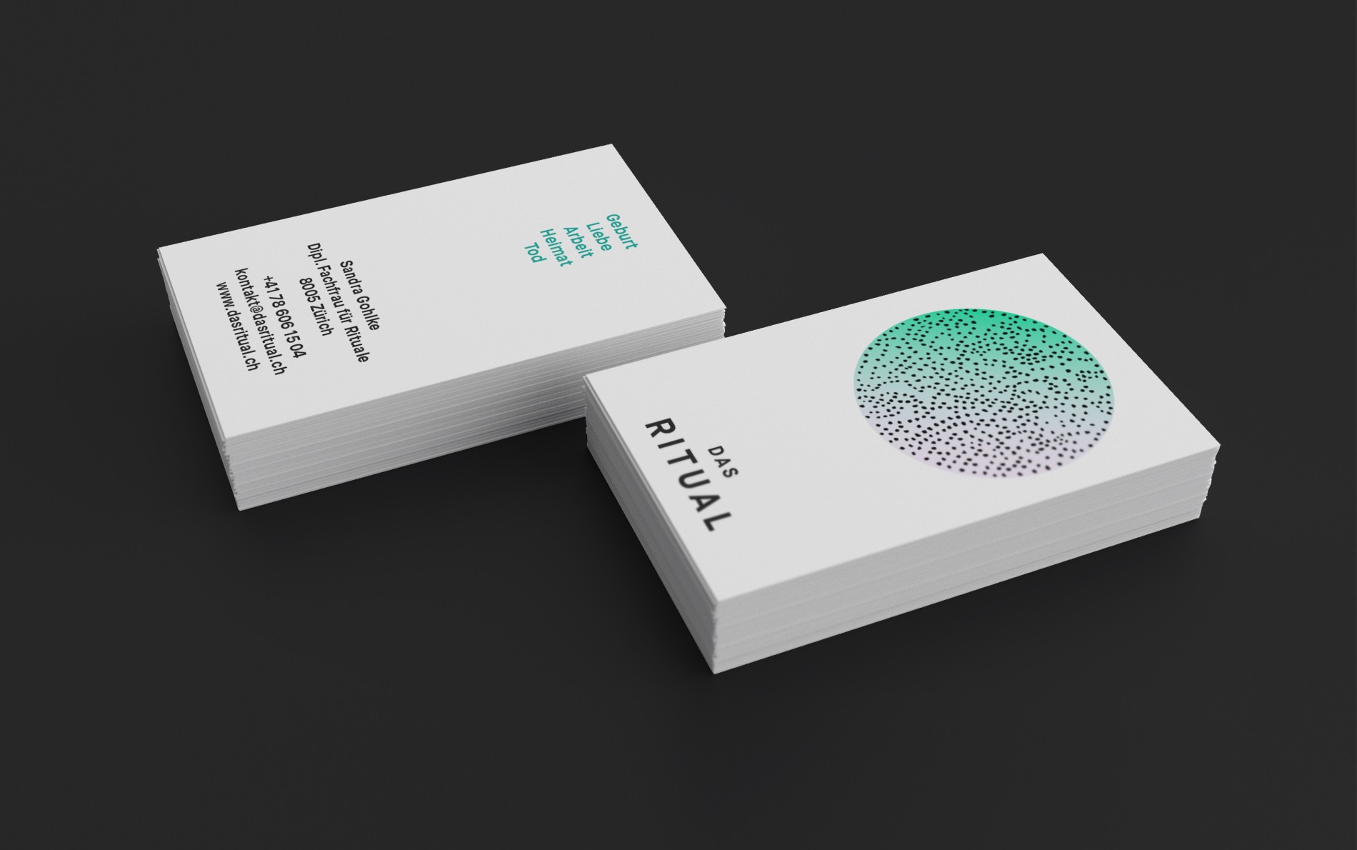 Zwei Frauen unterstützen besondere Übergänge – Das Ritual begleitet Menschen bei Geburt, Abschied, Heimatfindung und Neubeginn. Für diesen besonderen Rahmen entstand ein Erscheinungsbild, das mit einem wandelbaren Logo arbeitet: Punkte, die sich formen, verbinden oder auflösen – je nach Thema.