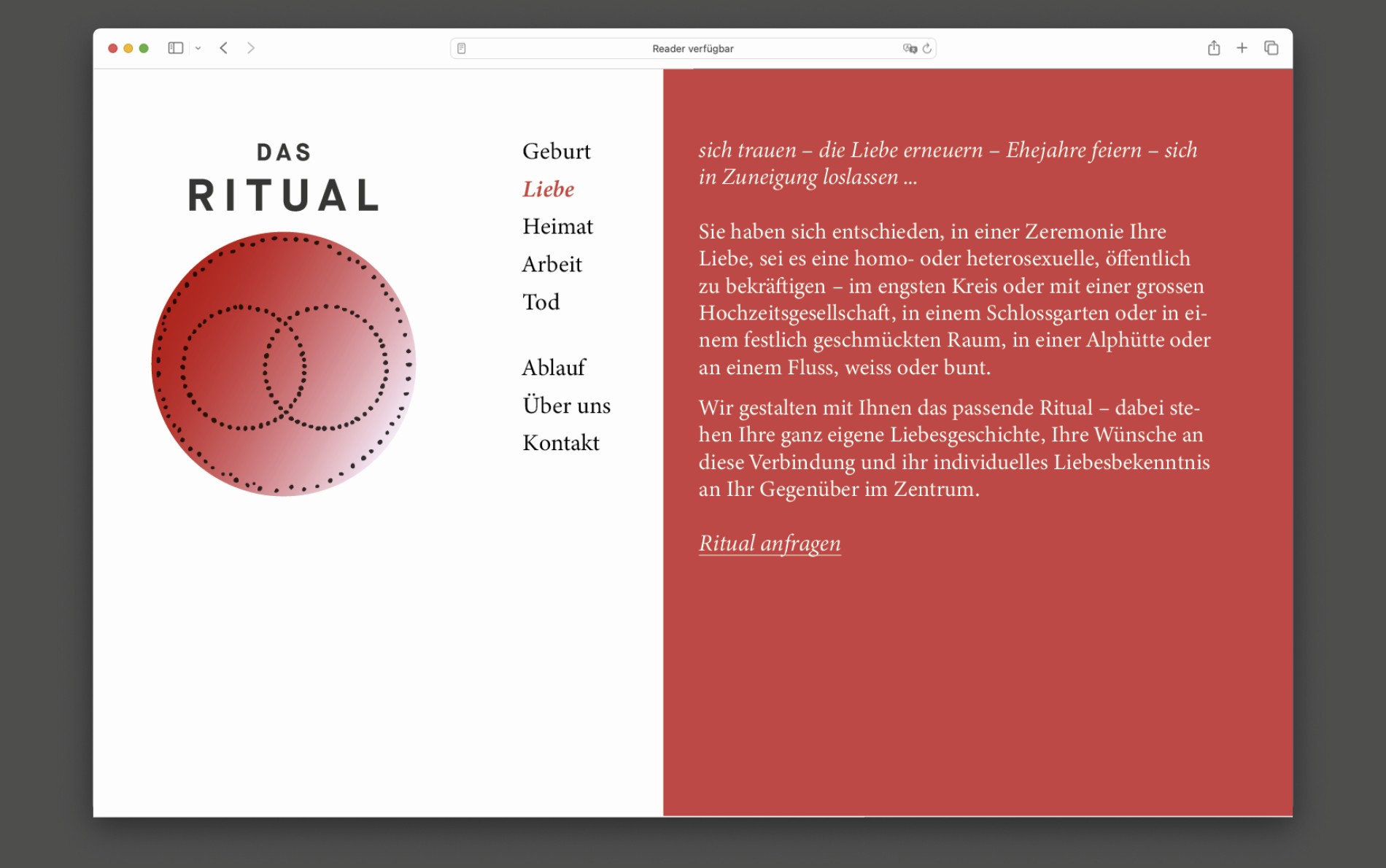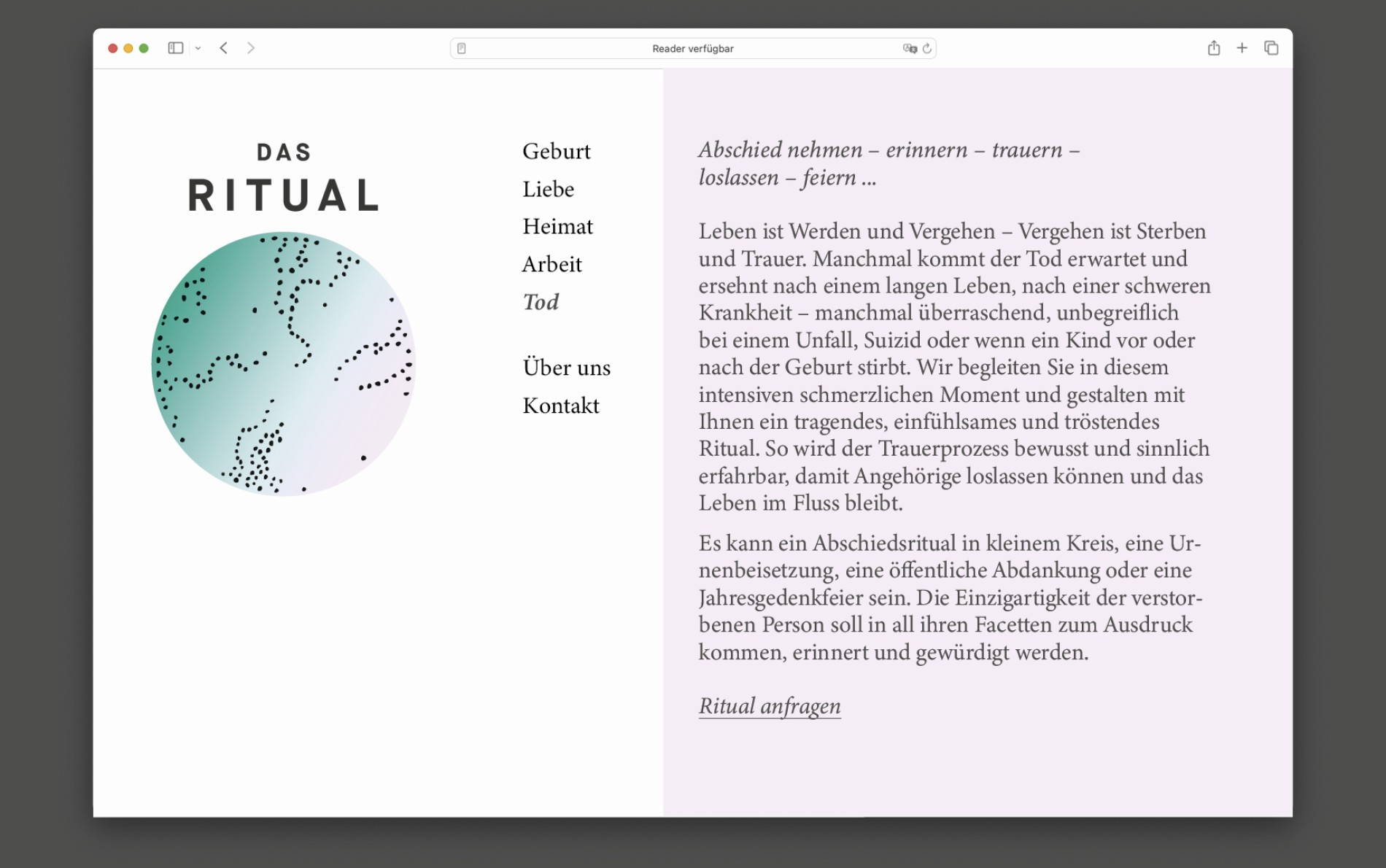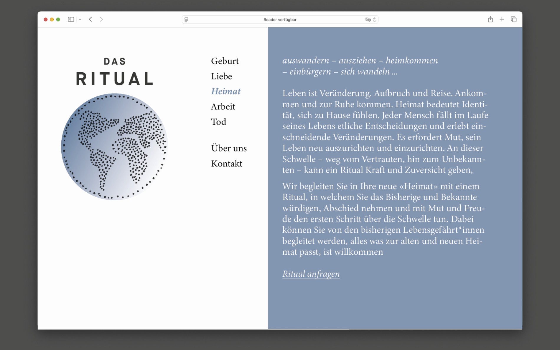 Zwei Frauen unterstützen besondere Übergänge – Das Ritual begleitet Menschen bei Geburt, Abschied, Heimatfindung und Neubeginn. Für diesen besonderen Rahmen entstand ein Erscheinungsbild, das mit einem wandelbaren Logo arbeitet: Punkte, die sich formen, verbinden oder auflösen – je nach Thema.