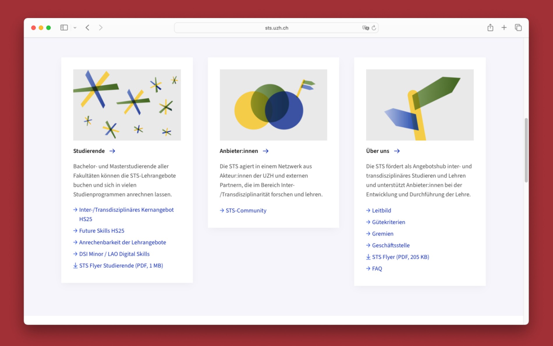 Für die visuelle Kommunikation wurde eine Bildidentität entwickelt, die das Zusammenspiel unterschiedlichster Themen und Denkweisen sichtbar macht: Überlappende Flächen erzeugen neue Formen und Farben – als Metapher für transdisziplinäre Begegnung. Eingesetzt auf Webgrafiken, Animationen, Social Media, Plakaten und mehr, bleibt das Design wandelbar, offen und neugierig – ganz wie die STS selbst.
