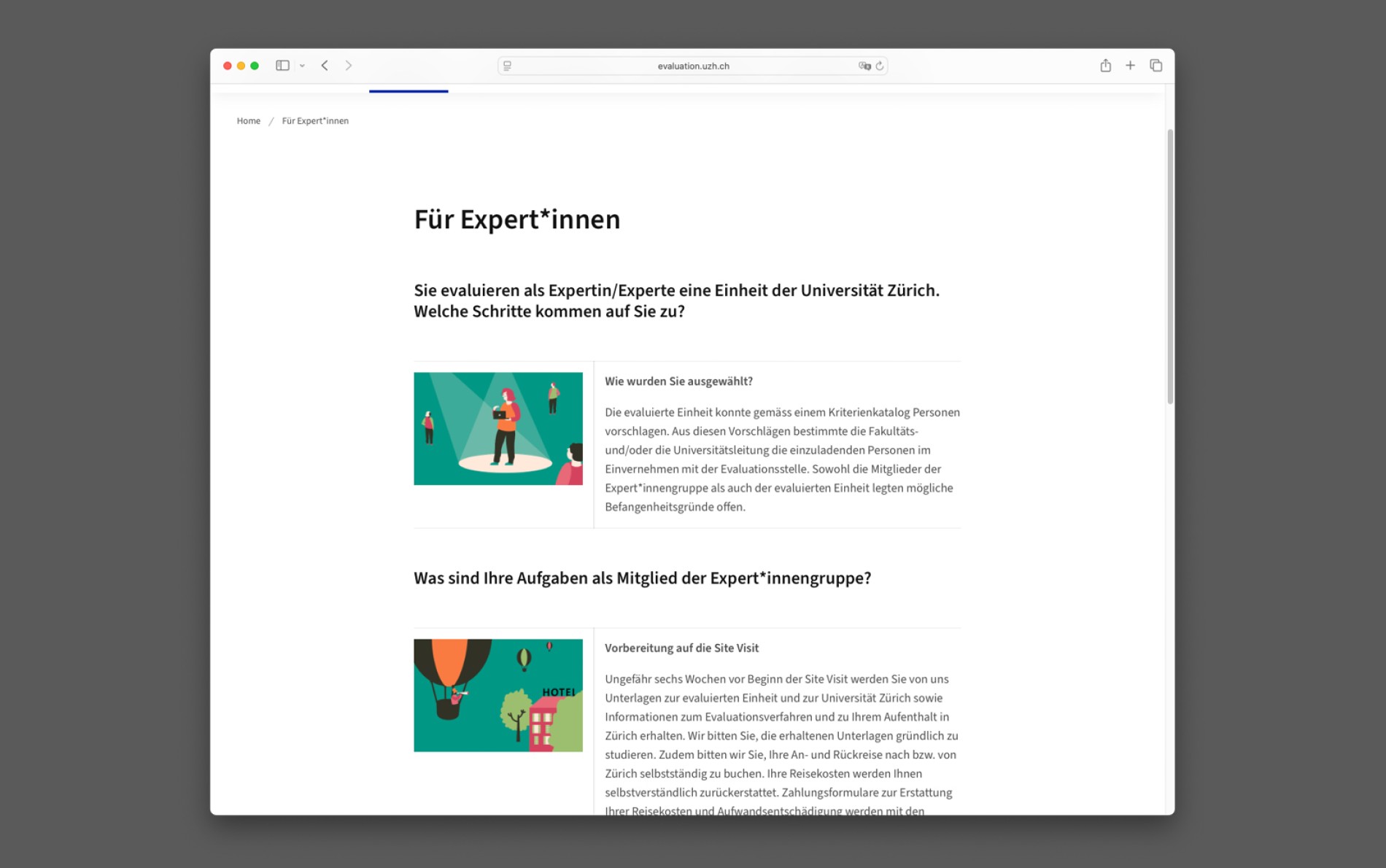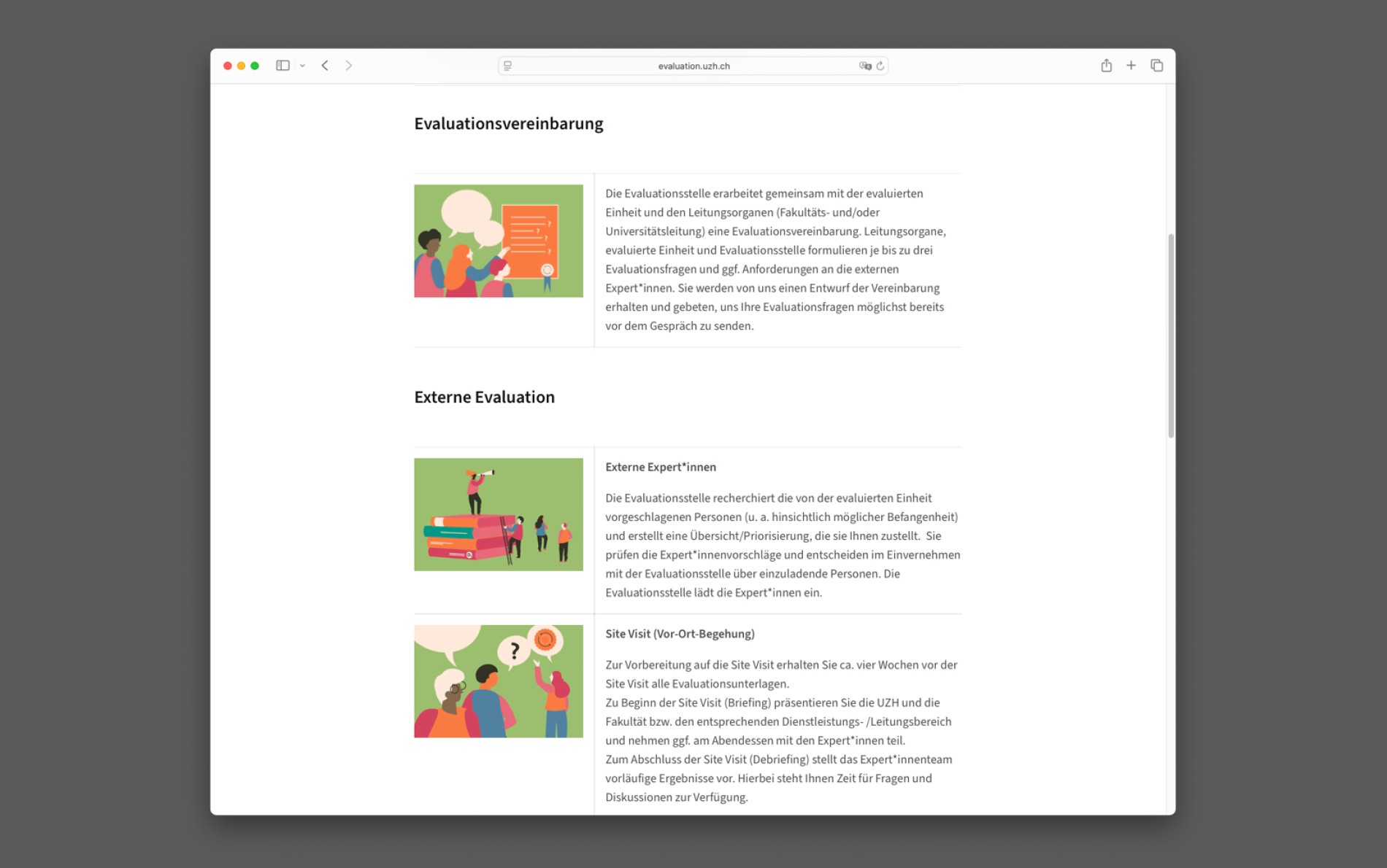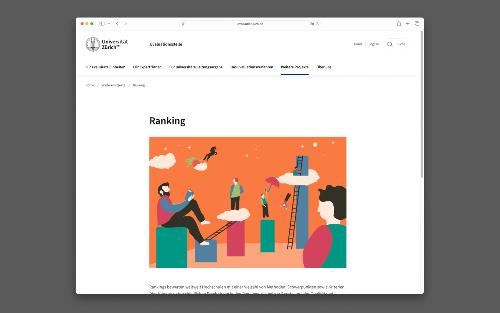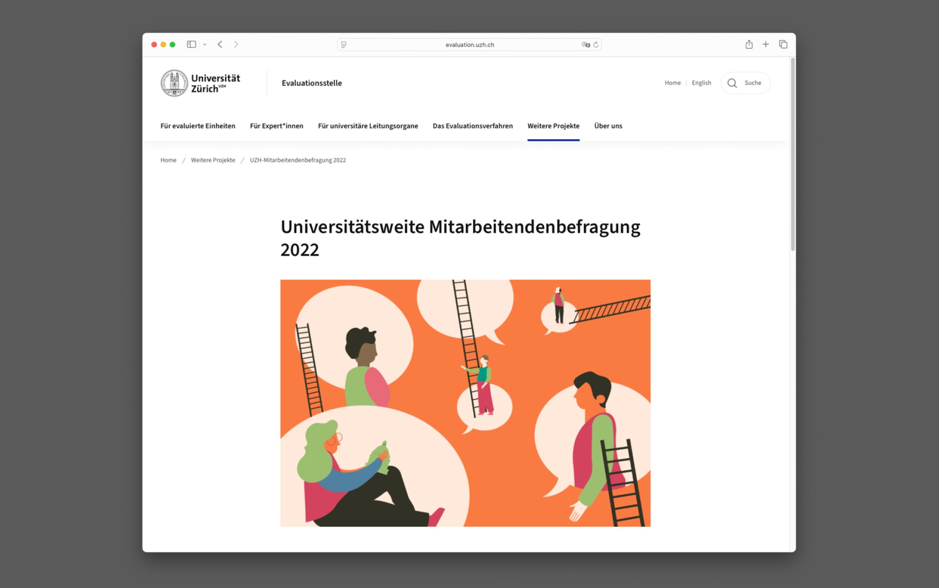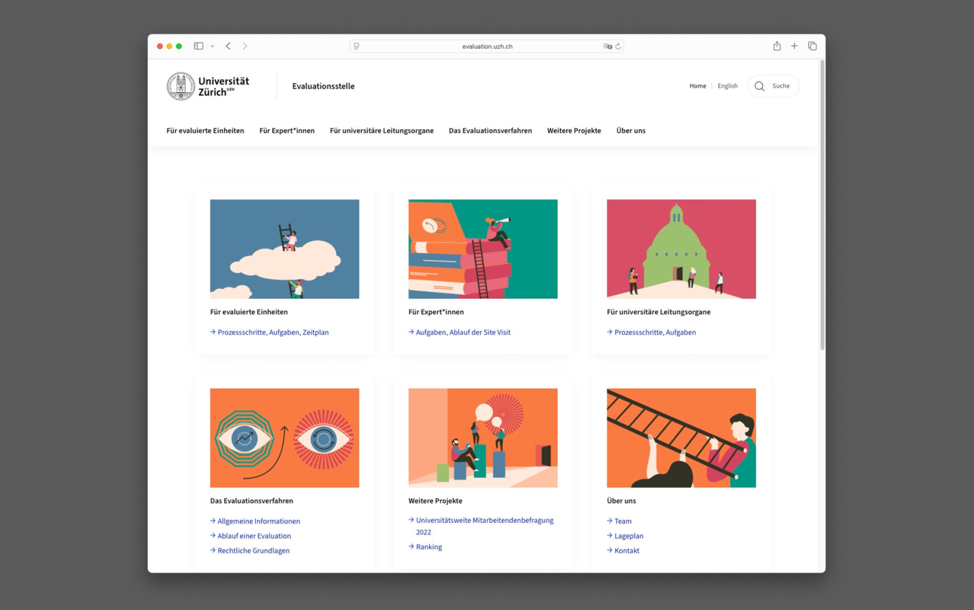 Für die Evaluationsstelle der Universität Zürich – zuständig für die unabhängige Begleitung und Bewertung von universitären Prozessen – entstand eine visuelle Identität, die mit Leichtigkeit, Klarheit und einem Augenzwinkern kommuniziert. Auf Basis des bestehenden Farbkonzepts wurden Nuancen feinjustiert, um Harmonie und Wiedererkennung zu stärken. Grafische Elemente aus der Welt der Infografik, kombiniert mit abstrahierten Leitermotiven als Symbol für die Prozesse, die die Qualität nach oben bringen, bilden das gestalterische Fundament. Die Illustrationen sind stilisiert, reduziert und divers. Der Stil ist zeitgemäss und doch zeitlos, so dass er über viele Jahre hinweg weitergeführt werden kann.